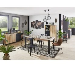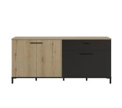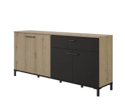 Inspiré des meubles d’atelier, ce buffet 4 portes/1 tiroir se caractérise par une structure revêtue de papier décor imitation chêne helvézia qui vient contraster élégamment avec les deux portes revêtues de papier décor noir. Esthétique et moderne, ce buffet imitation chêne et noir conférera un style industriel à votre intérieur.