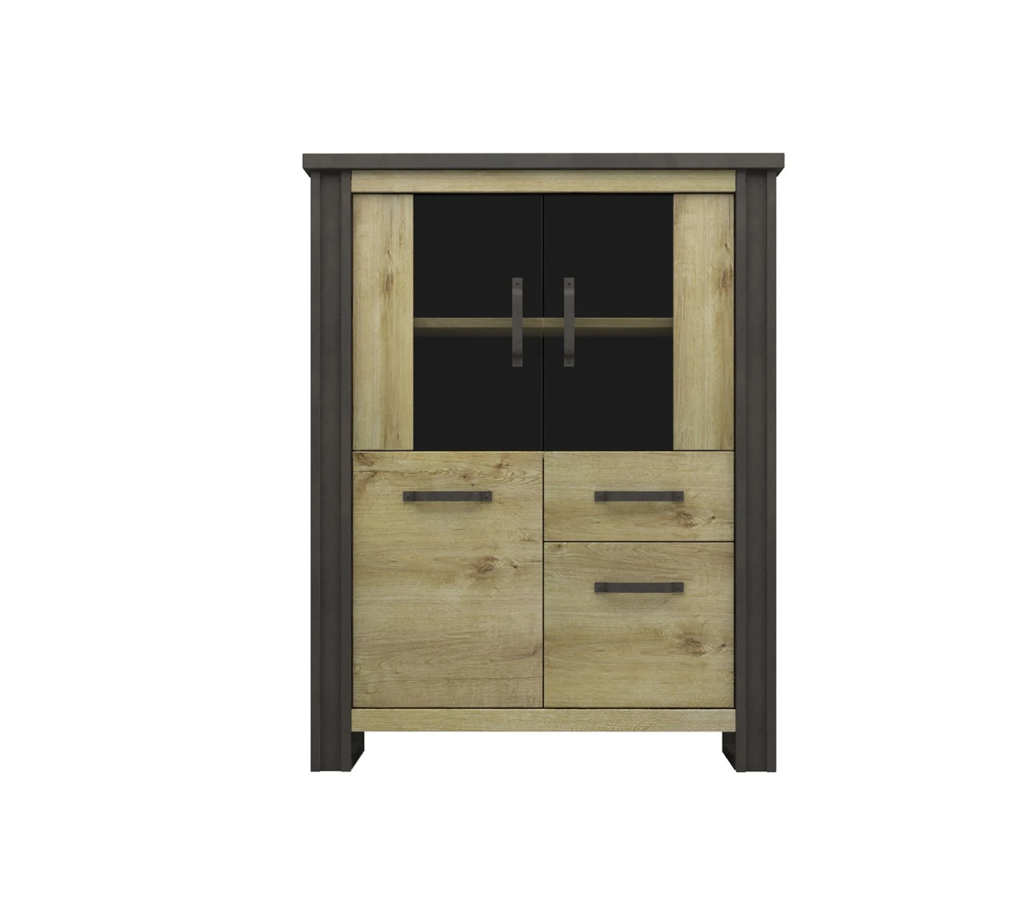Ce buffet imitation chênese distingue par ses montants latéraux contrastants faisant également office de piètement. Réalisés dans une teinte plus sombre, ils s’associent parfaitement à d’autres meubles de style industriel. Pour créer une décoration coordonnée, vous pouvez opter pour le buffet bas et la table de salle à manger de la même collection.