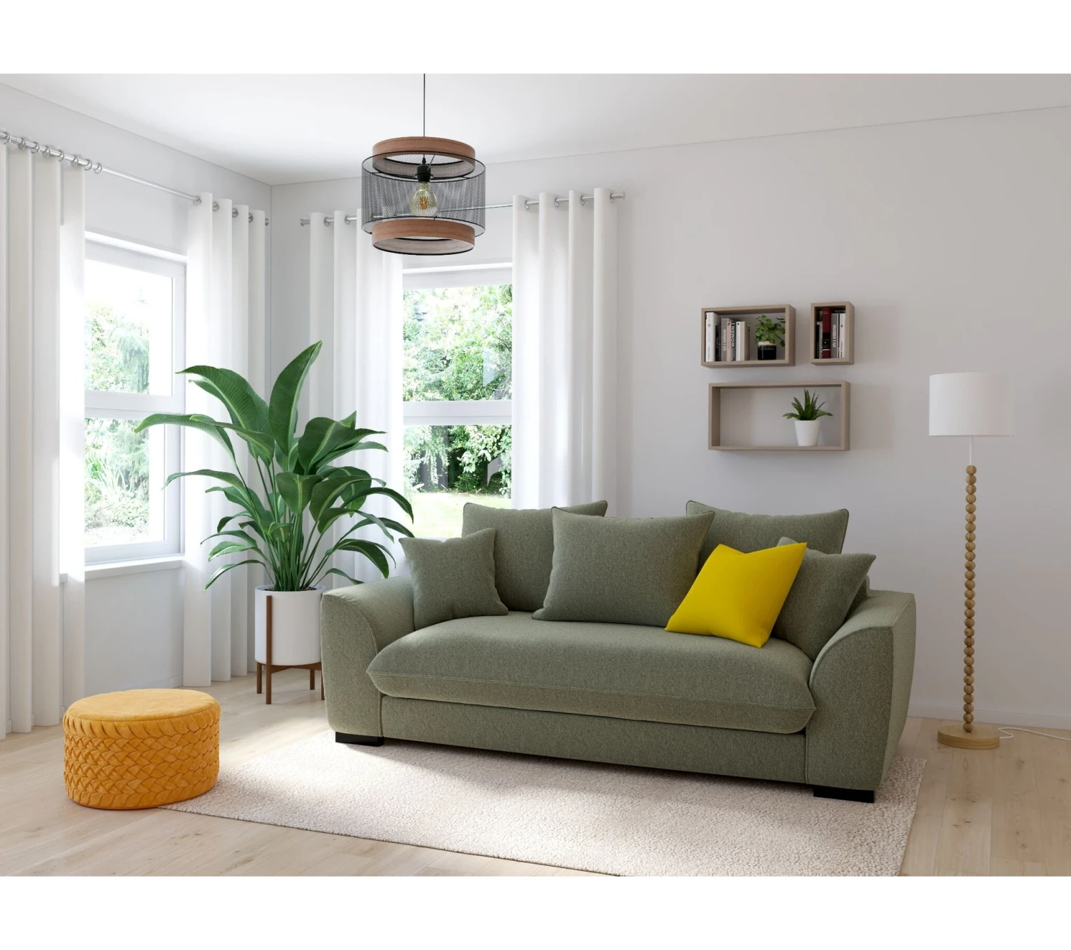 Avec son accumulation de coussins douillets, ce canapé en tissu invite à se blottir. L’assise de ce canapé convertibleest garnie de mousse polyéther d’une densité de 28 kg/m³ tandis que les coussins sont rembourrés de flocons de fibres creuses siliconées 100 % polyester.