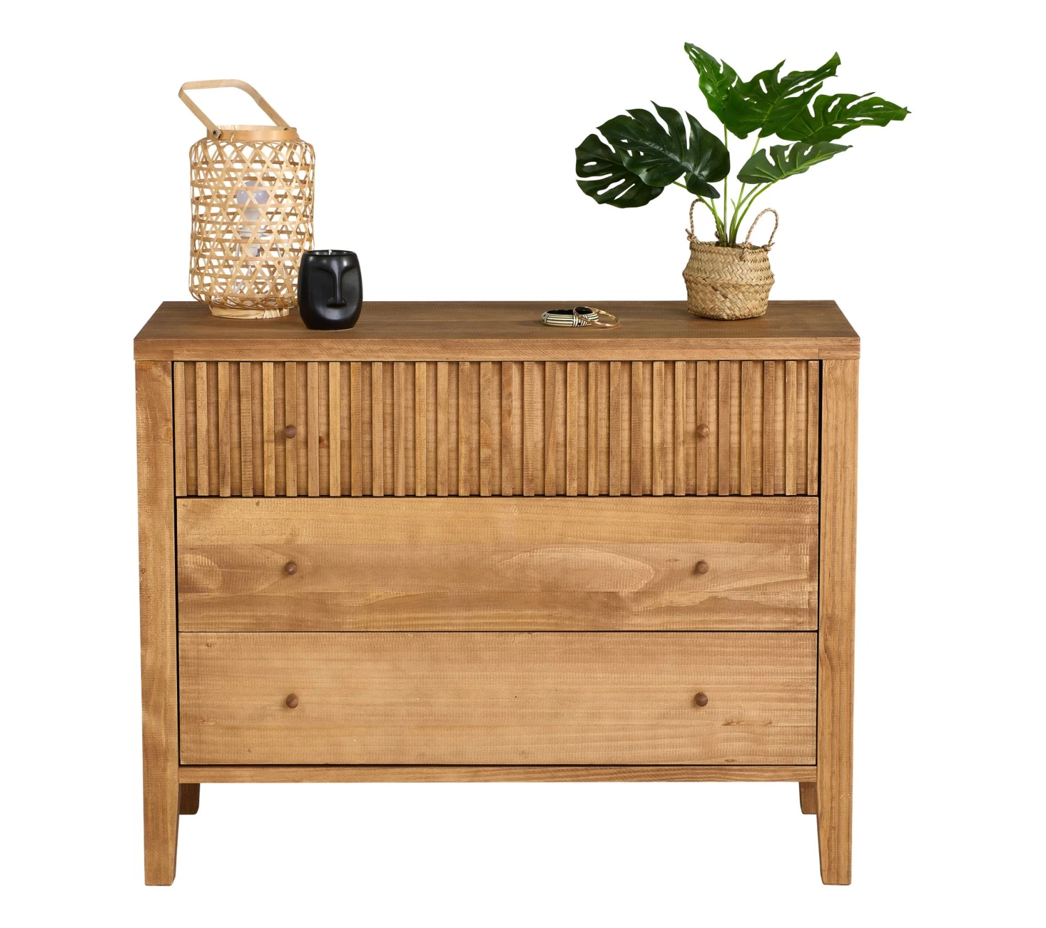Quelle que soit la pièce où vous souhaitez l’installer, la commode EQUATORIAapportera des rangements pratiques. Que ce soit pour conserver des vêtements, des accessoires ou des objets du quotidien, elle aura différentes utilités. Munie de 3 tiroirs, cette commode dispose d’un plateau supérieur que vous pourrez décorer d’une lampe ou d’une plante. Les tiroirs s’ouvrent facilement à l’aide des boutons placés en façade. Peu encombrante, cette commode de 100 x 78 x 45 cmprendra un minimum de place dans votre pièce. Pour enlever la poussière, passez simplement un chiffon sec et propre sur la surface cirée.