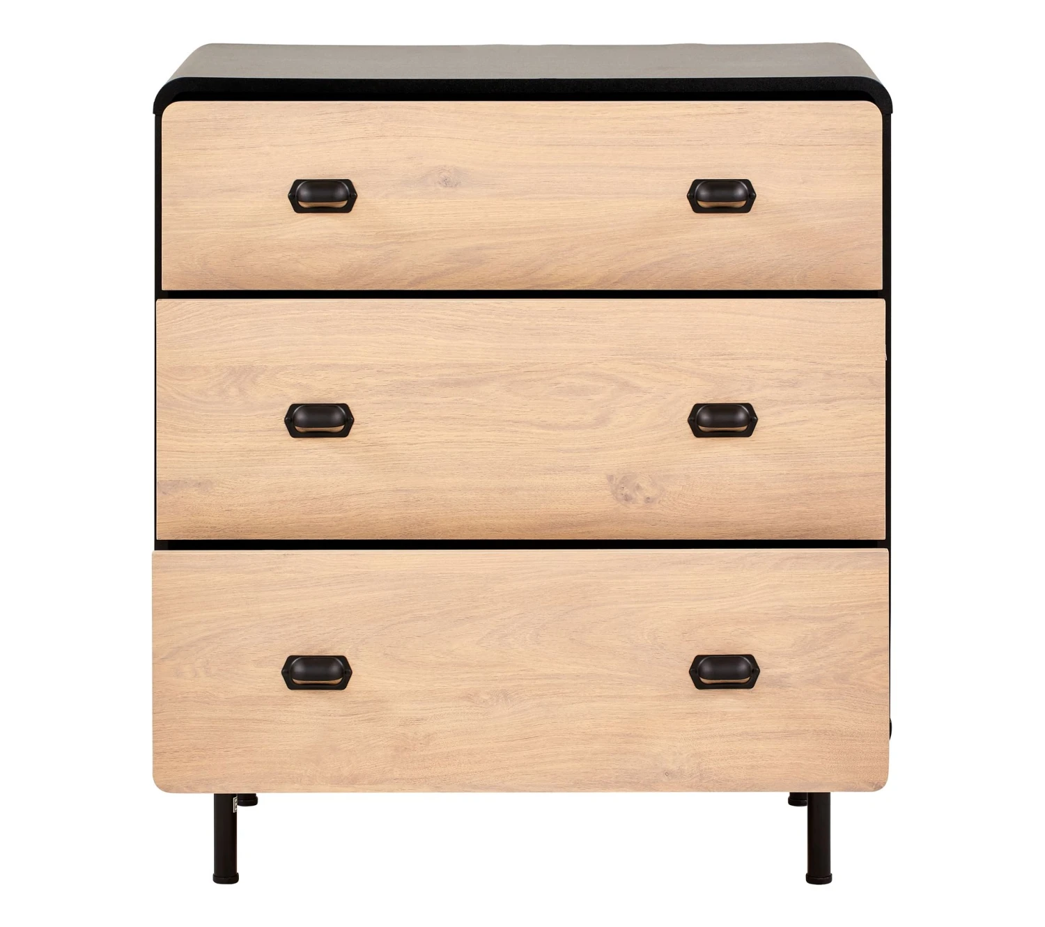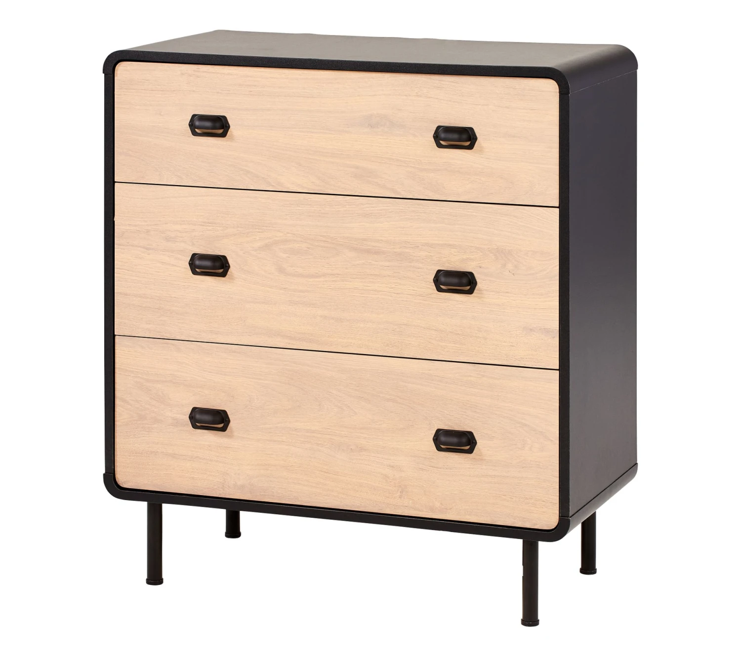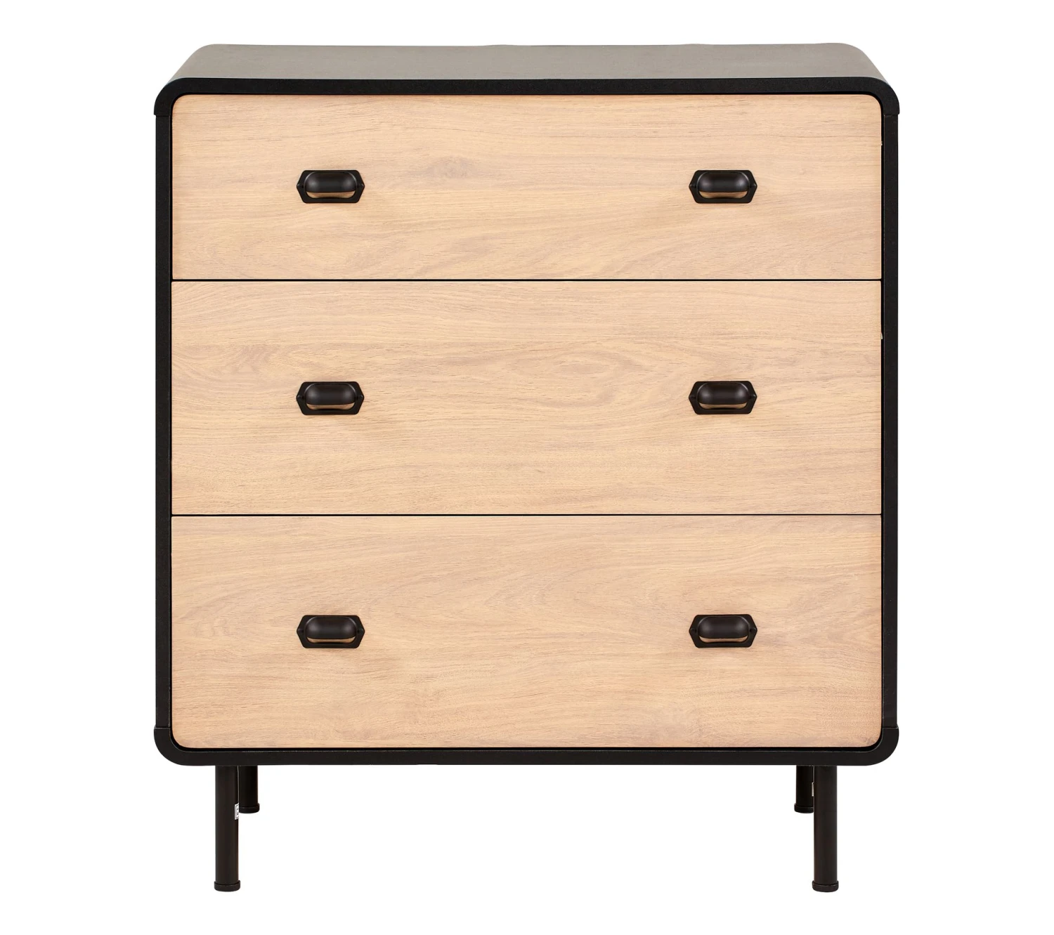 Que ce soit pour meubler un salon, une entrée ou encore habiller une chambre avec caractère, cette commode offre un beau volume de rangement. Pratique, elle dispose de trois tiroirs profonds et d’un plateau noir élégant sur lequel poser des objets de déco chinés, une mappemonde rétro ou encore un luminaire. Les dimensions de cette commode de L. 79 x H. 87 x P. 39 cm en font un mobilier de faible profondeur idéal pour investir toutes les pièces sans les encombrer. Facile à nettoyer, il suffit de passer un chiffon en microfibre pour l’entretenir.