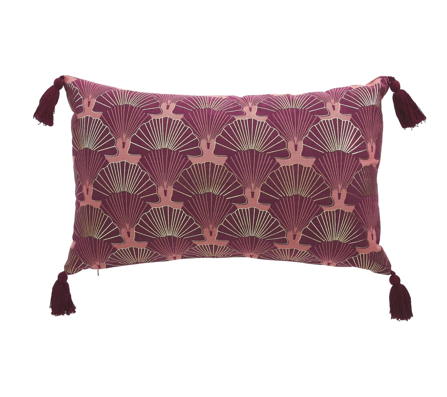 Craquez pour l’élégance de ce coussin violet et or décoré d’éventails qui lui donnent ce côté art déco dans l’air du temps. Chaque coin est complété par un pompon en lainage qui lui apporte une touche d’élégance supplémentaire. Garni de mousse, ce coussin possède une housse 100 % coton à la fois résistante et douce.