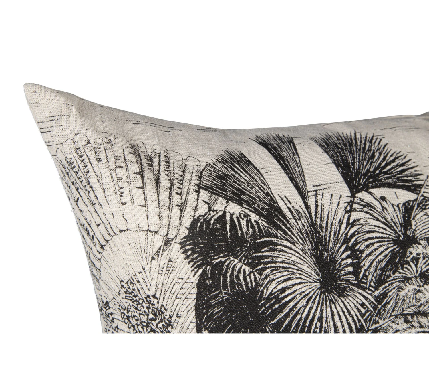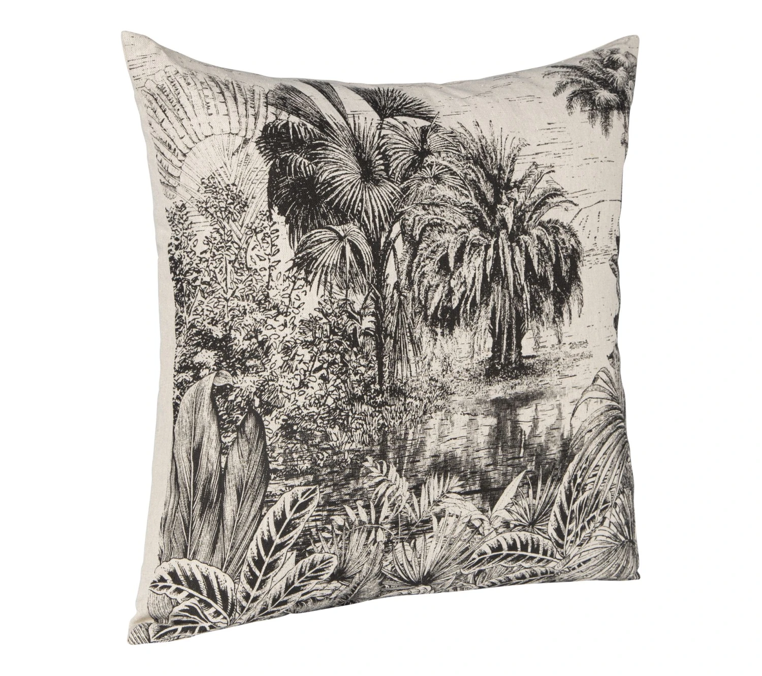 Coussin carré déhoussableLe coussin PALMIERS est composé d’un garnissage en fibres de polyester ainsi que d’une housse en polyester, coton et viscose. L’intérieur du coussin est suffisamment ferme pour soutenir votre dos ou votre cou quand vous vous relaxez dans le fauteuil. La housse est résistante à l’usure et à la lumière, et conserve son joli coloris. Vous pourrez la retirer du coussin pour la laver en machine. Ce coussin de dimensions 45 x 45 cm présente la taille idéale pour décorer un canapé ou un fauteuil. Vous pourrez le combiner avec plusieurs coussins unis pour créer votre décoration personnalisée.Motif effet gravure vintageSur le dessus, ce coussin naturel est orné d’un paysage de palmiers et autres plantes, donnant l’effet d’une gravure. Le dessous du coussin est uni. Ce design à la fois vintage et naturel peut être intégré dans une décoration de style rétro, bohème ou scandinave. Les couleurs sobres de ce coussin carré sont faciles à assortir.