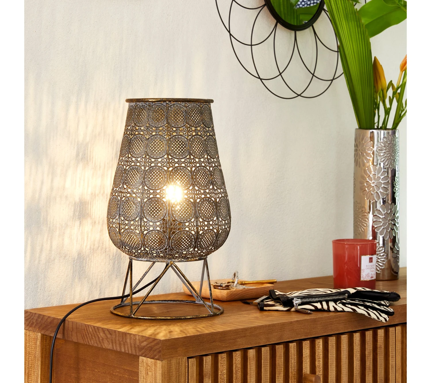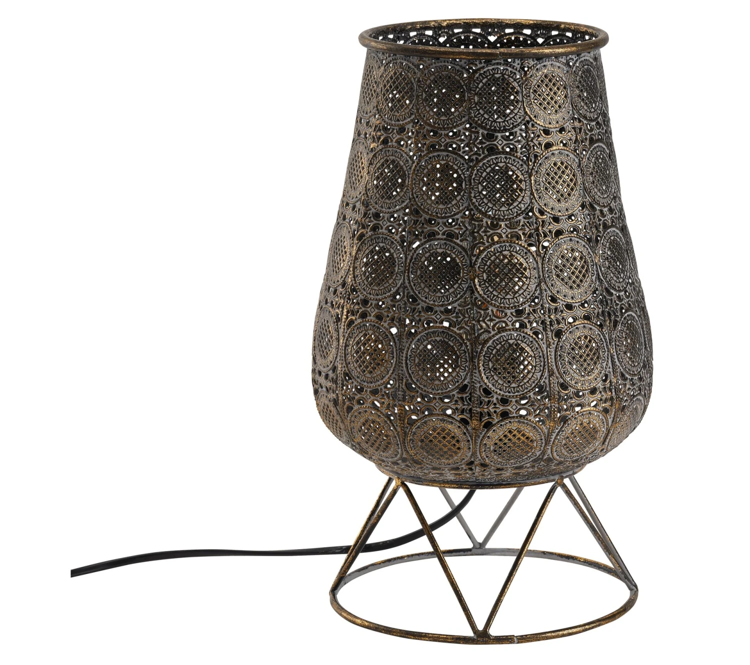 La lampe ajourée DELHI vous charmera par ses airs d’ailleurs parfaits pour ajouter une pointe d’exotisme à votre décoration d’intérieur. D’inspiration indienne, elle est réalisée dans du métal finement ouvragé qui laisse apparaitre l’ampoule tout en en tamisant l’éclat. Cette lampe de 37,5 cm de hauteur se compose d’un pied en métal filaire et d’un abat-jour à la forme de tulipe originale. Les finitions sont brutes et le coloris légèrement doré apporte une touche chic à l’ensemble. Cette lampe fonctionne avec une ampoule de type E27 d’une puissance maximale de 40 watts non fournie. Elle ne requiert aucun assemblage.