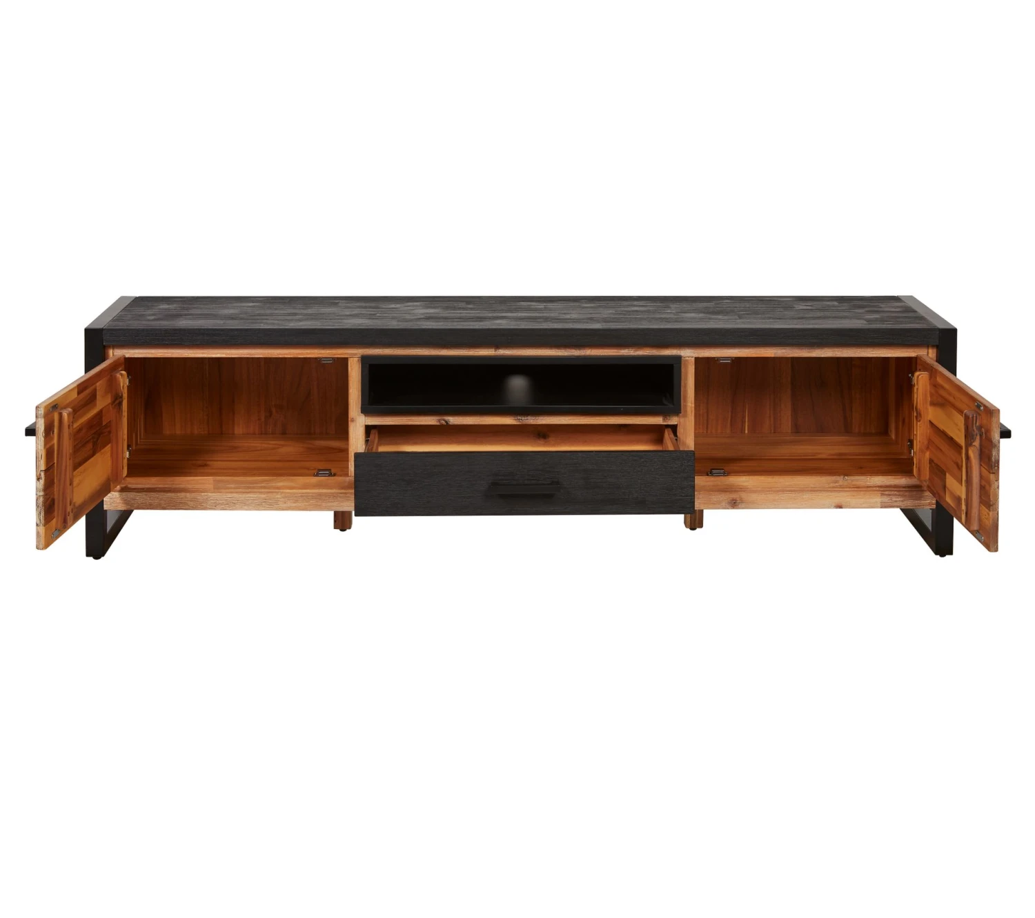 Meuble TV industriel tendanceTransformez votre pièce avec ce meuble TV élégant, en bois naturel et bois peint en noir. Bas et droit, ce meuble TV industriel apporte du caractère à votre salon. La couleur de son encadrement en bois est reprise sur le tiroir, la niche et les poignées des portes, formant un contraste du plus bel effet.Facilité de montageLivré en un seul colis, ce meuble TV droit est facile à monter. Son montage est rapide et demande peu d’outils. Dans la notice fournie dans le colis, vous trouverez toutes les indications pour assembler ce meuble TV de 190 cm de longueur, 50 cm de hauteur et 42 cm de profondeur.Grand meuble avec rangementsCe long meuble TV en bois possède plusieurs rangements pratiques. Il est muni de deux portes, d’un tiroir et d’une niche. Sur le fond de ce meuble TV avec tiroir, des trous sont prévus pour le passage des câbles. Ce meuble TV noir et bois naturel offre un excellent rapport qualité/prix.