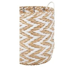 Laissez-vous séduire par ce panier blanc et naturel qui s’habille de motifs d’inspiration ethnique. Il se mariera à merveille avec des éléments naturels pour créer un décor bohème. Entièrement réalisé à la main, ce panier est conçu en jonc et en paille de papier avec une structure en fer.