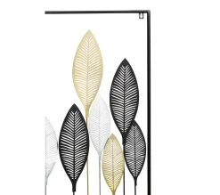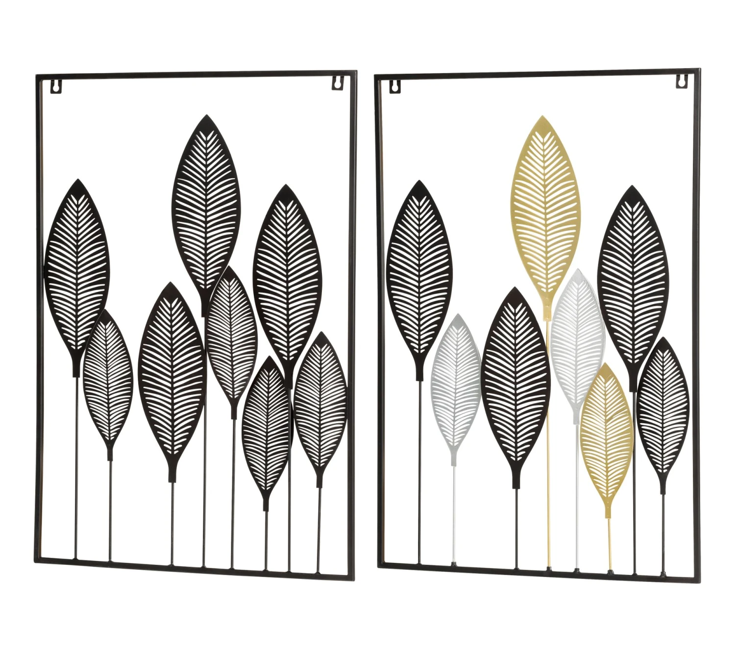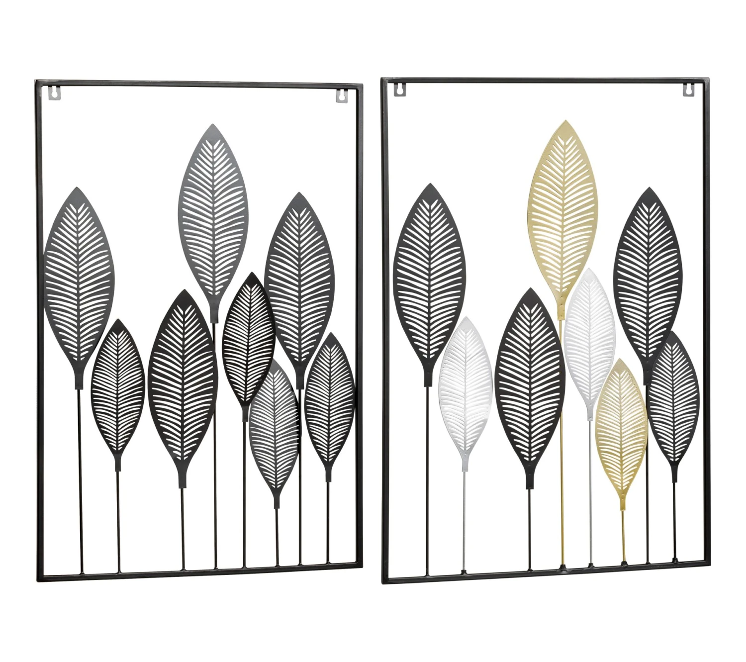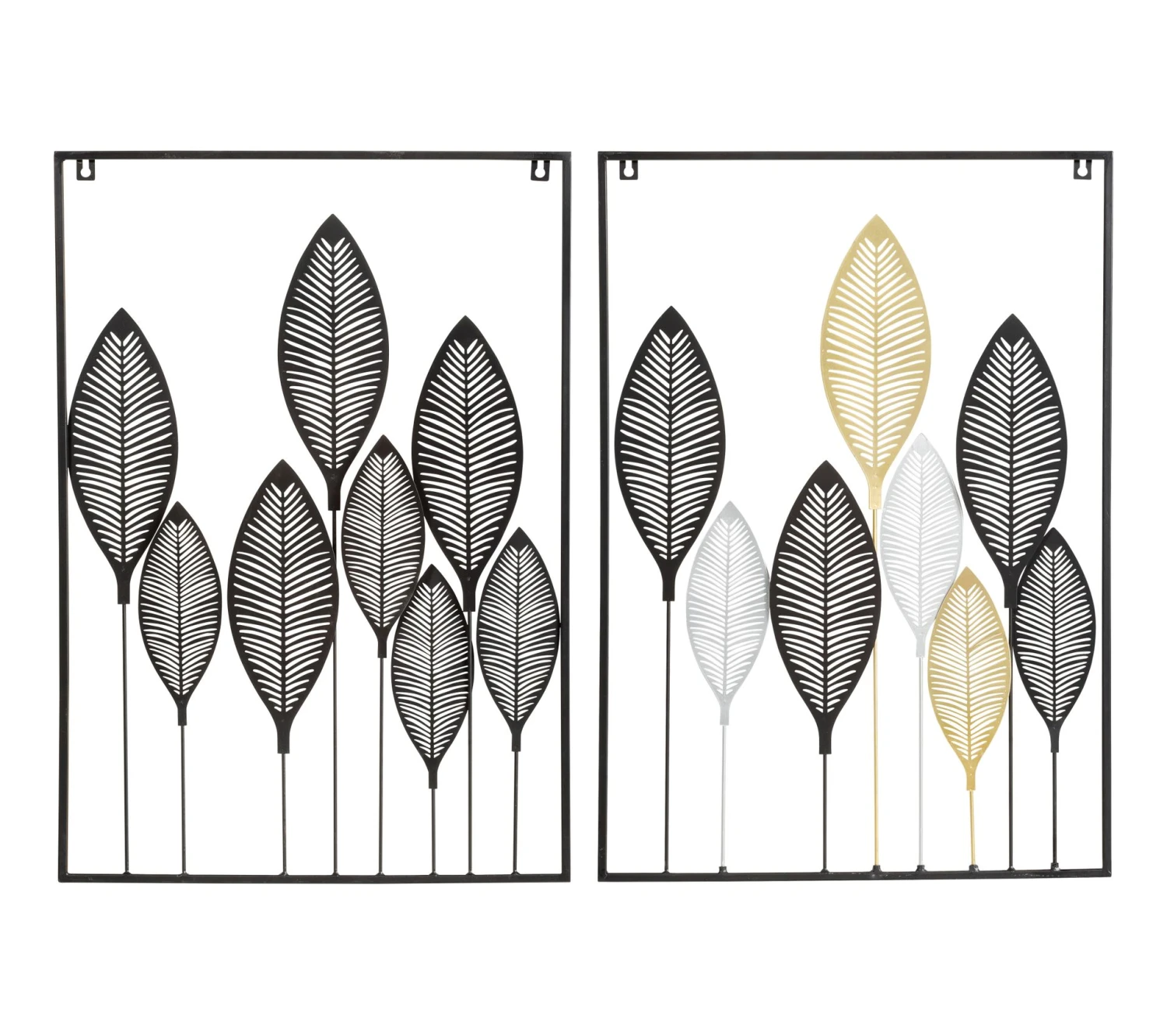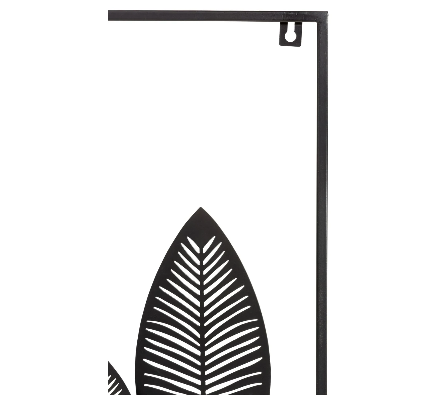 La plaque déco ELENA est une décoration murale originale, qui se compose d?un cadre en métal noir dans lequel sont fixées des feuilles ajourées. Sur certains modèles, les feuilles peuvent être colorées dans des teintes métallisées, sur d?autres, elles sont en noir uni. Cette plaque de 78 x 55 cm dispose d?un système d?accroche facile, avec deux petites encoches situées en haut. Vous avez ainsi l?assurance qu?elle reste bien droite après l?installation. Comme elle est entièrement en métal peint, cette plaque décorative est robuste. Elle ne réclame aucun entretien particulier, mais vous pouvez la dépoussiérer avec un chiffon doux ou un plumeau en cas de besoin.