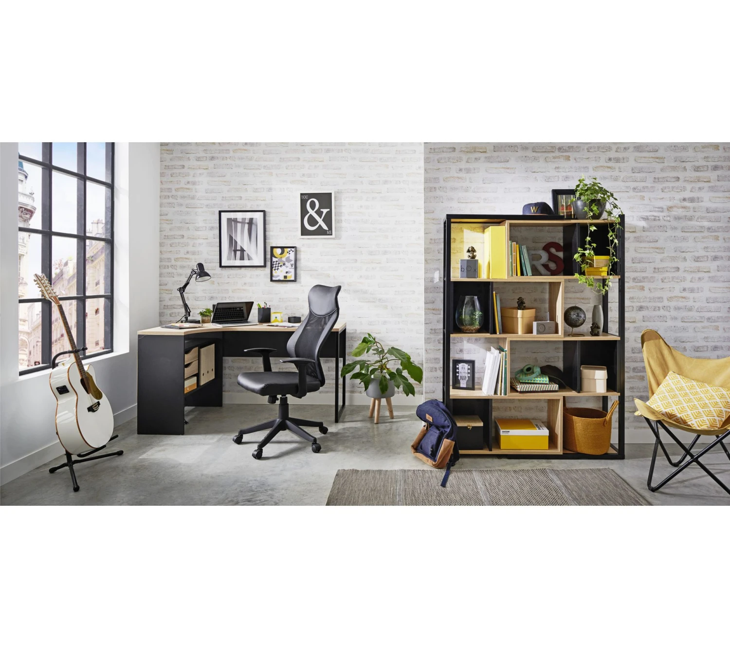 Particulièrement tendance, le style industriel fait la part belle aux matières brutes et aux finitions naturelles. Avec cette séparation extensible de 80 à 152 cm, vous disposez d’un meuble de rangement pratique et adaptable aux moindres espaces de votre intérieur. Assortissez cette séparation d’angle coloris imitation chêne et noir avec un bureau en acier pour un effet coordonné.