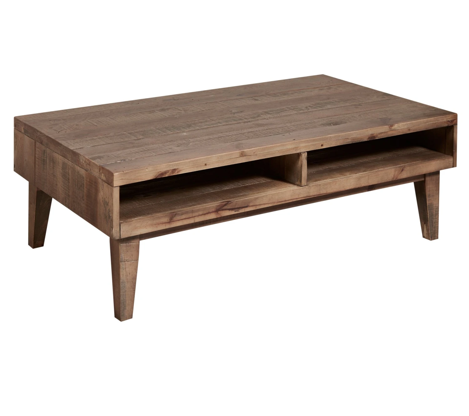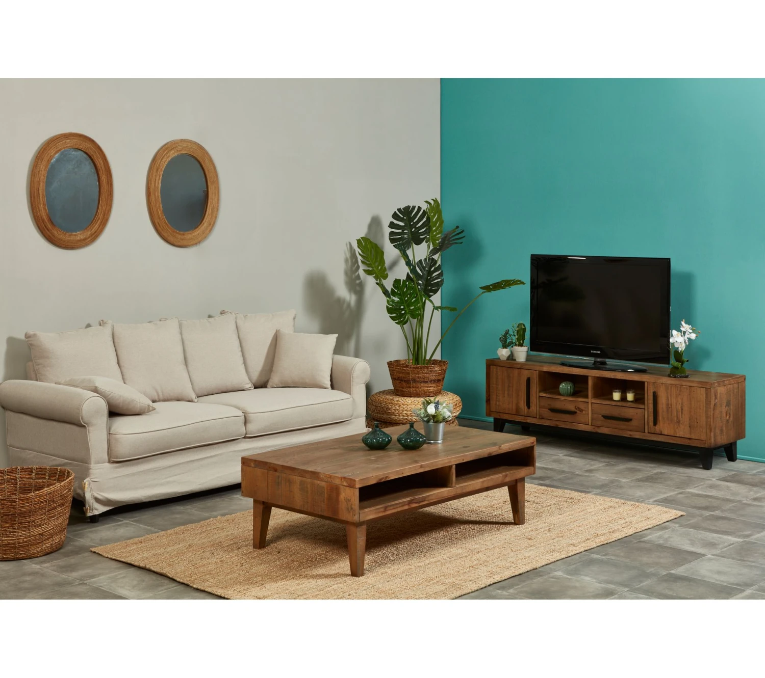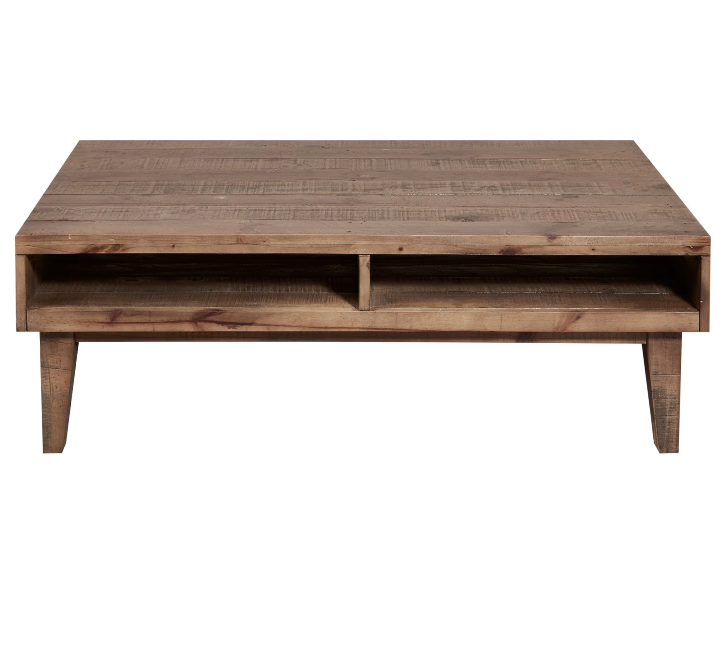 De solides garantiesDe par sa fabrication, cette table basse PATIO offre de solides garanties Tout d’abord, elle se compose de pin massif, une essence robuste et durable. De plus, il s’agit de bois recyclé : cette table basse a donc été construite dans le respect de l’environnement. En l’achetant, non seulement vous faites un geste pour la planète, mais vous devenez également le propriétaire d’un meuble fonctionnel, doté de plusieurs espaces de rangement. En effet, deux niches s’étendent sous toute la surface du plateau de cette table basse de dimensions L. 120 x H. 40 x P. 70 cm. Vous pourrez y glisser journaux et télécommandes.Une allure rustiqueL’allure rustique de cette table basse en pin naturel, juchée sur un piétement en biseau, est appropriée à un salon d’inspiration champêtre ou montagnarde. Chaleureuse et authentique, la structure en bois massif est un véritable plus pour le décor, qu’elle enrichit et met en valeur.